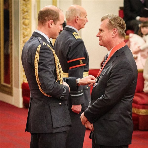 诺兰与夫人因对电影行业的贡献受封骑士爵位,今后称呼这位导演要冠以爵士头衔了。之前诺兰因一系列艺术成就在2019年获颁CBE勋章,当时由威廉王子主持颁奖仪式: