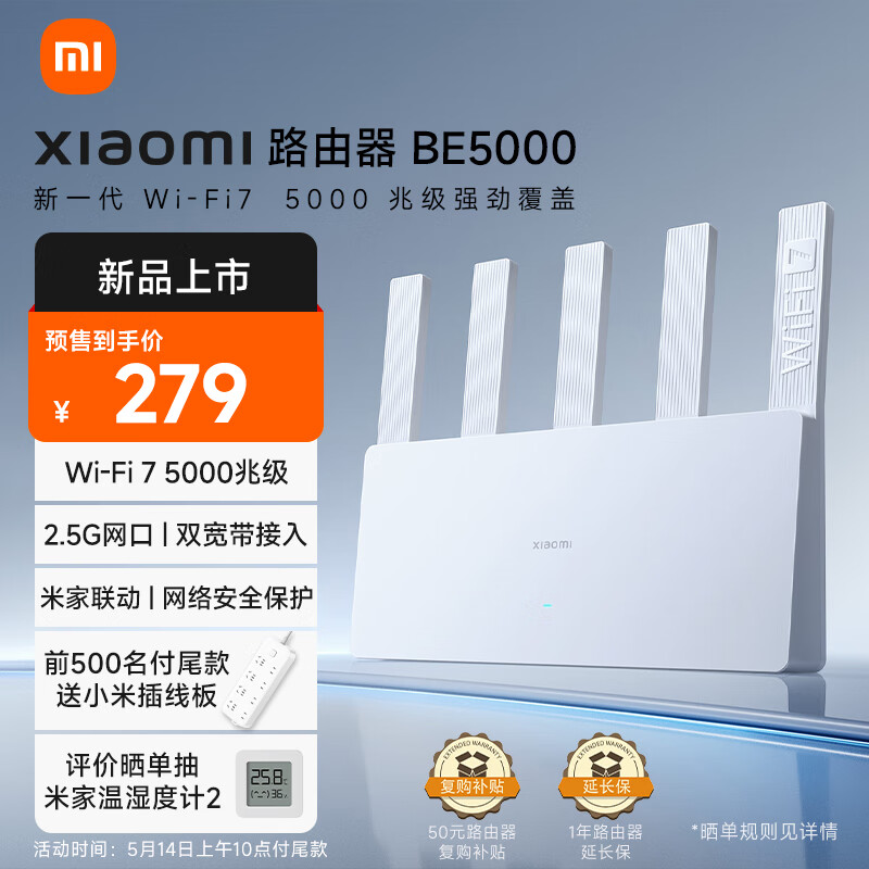 IT之家 5 月 9 日消息,日前,小米路由器 BE5000 Wi-Fi 7 上架京东等电商平台,预售价 279 元,5 月 14 日支付尾款。