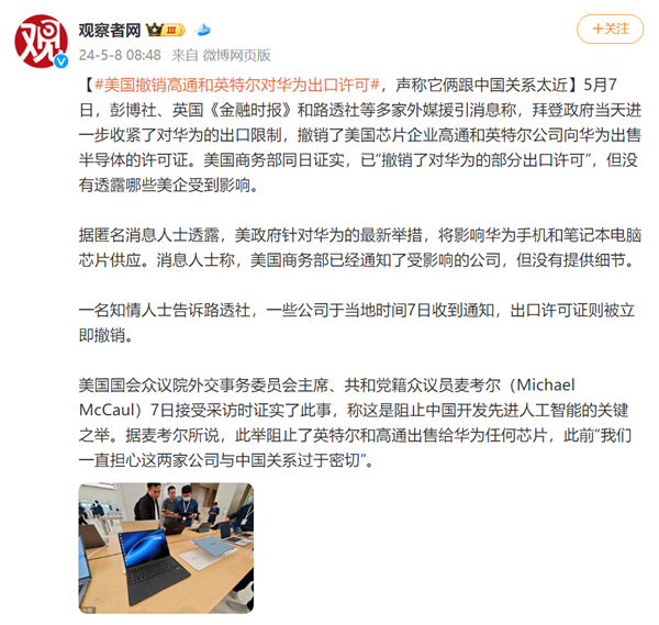 不知道各位差友今天有没有看到这样一条新闻:美国撤销了本土芯片企业高通和英特尔公司向华为出售半导体的许可证,这意味着之后华为自家产品很有可能用不了这两家公司的芯片。