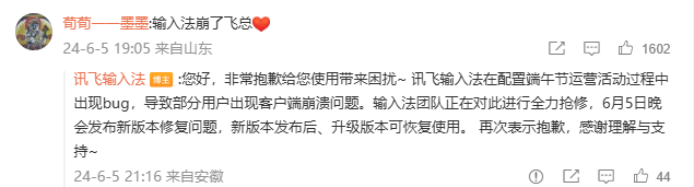 讯飞输入法官方回应称:讯飞输入法在配置端午节运营活动过程中出现 Bug,导致部分用户出现客户端崩溃问题。