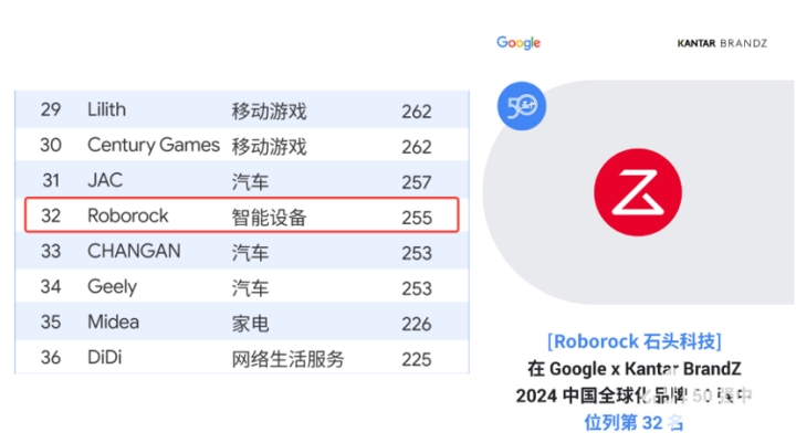 6月20日,Google谷歌与全球知名咨询机构凯度联合发布了《Google x Kantar BrandZ中国全球化品牌2024》榜单,其中石头科技作为中国智能设备领域的创新品牌代表,进入中国全球化品牌50强及成长明星榜并排名第32位。