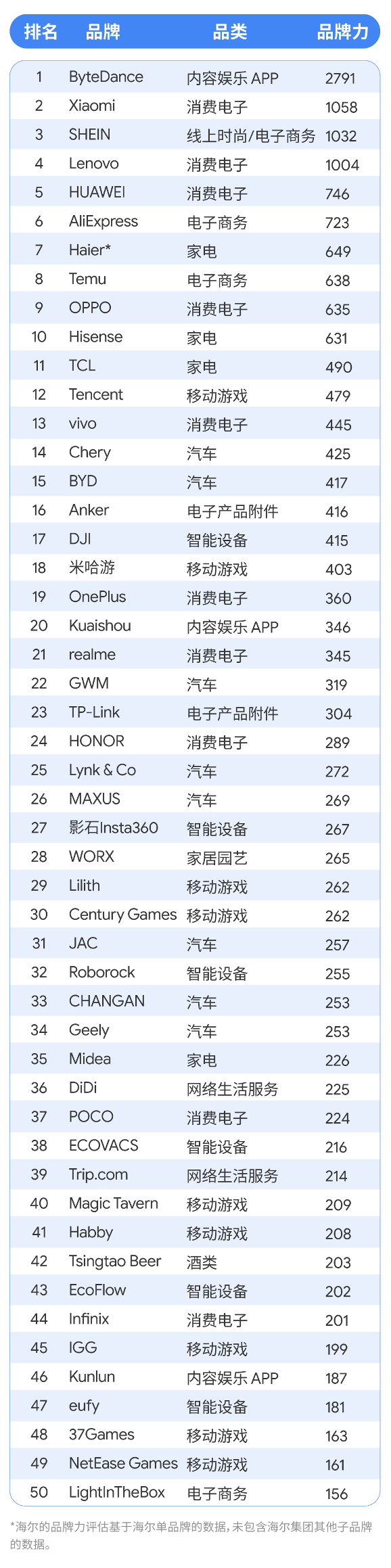 2024年中国全球化品牌榜单的50强品牌来自于七大主要品类,品牌力占比最大的品类仍然是消费电子(25%),汽车行业是品牌力高速增长的行业,2024年共有8个汽车品牌进入榜单,品牌力增长高达51%;其中,智能设备行业的品牌力增长最为显著,达到了61%。中国的品牌之林已然形成,各个行业的竞争格局都不再是一家独大,而是群雄逐鹿,各擅胜场。