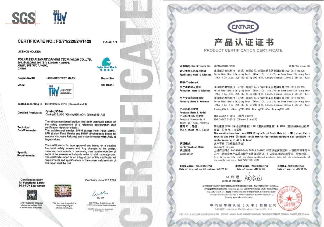 北极雄芯介绍称,基于 935 HUB Chiplet 及 AI Chiplet 异构集成的多颗自动驾驶芯片已于 2024 年取得 SGS 以及中汽研境内外 ISO-26262 ASIL-B 车规级双认证,是国内首个取得车规级认证的 Chiplet 产品,预计将于 2024 年底提供核心板交付下游开展适配工作。