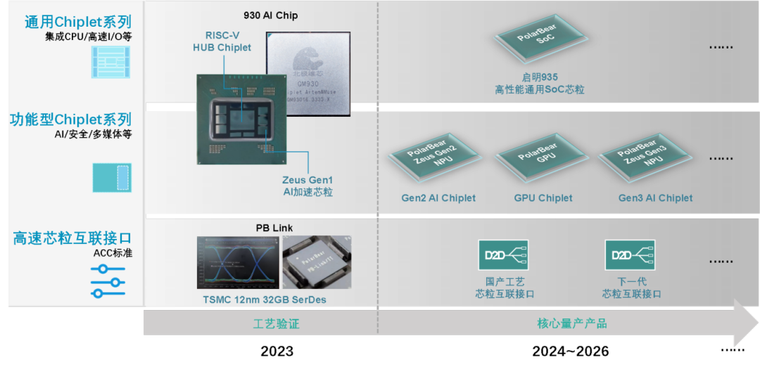 北极雄芯于 2023 年初完成测试并发布了国内首个基于 Chiplet 架构的“启明 930”芯片,在国产封装供应链上成功完成了工艺验证;同年,该公司发布了首个基于国内《高速芯粒互联标准》的 D2D 接口 PB Link。