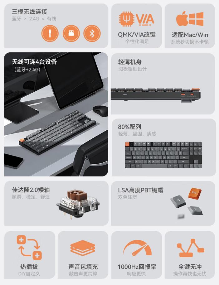 据介绍,这款机械键盘使用佳达隆?2.0?矮轴,配备?LSA?高度?PBT?键帽,支持热插拔及全键无冲,可选红 / 茶 / 青三种轴体,不过目前青轴版暂未上架。