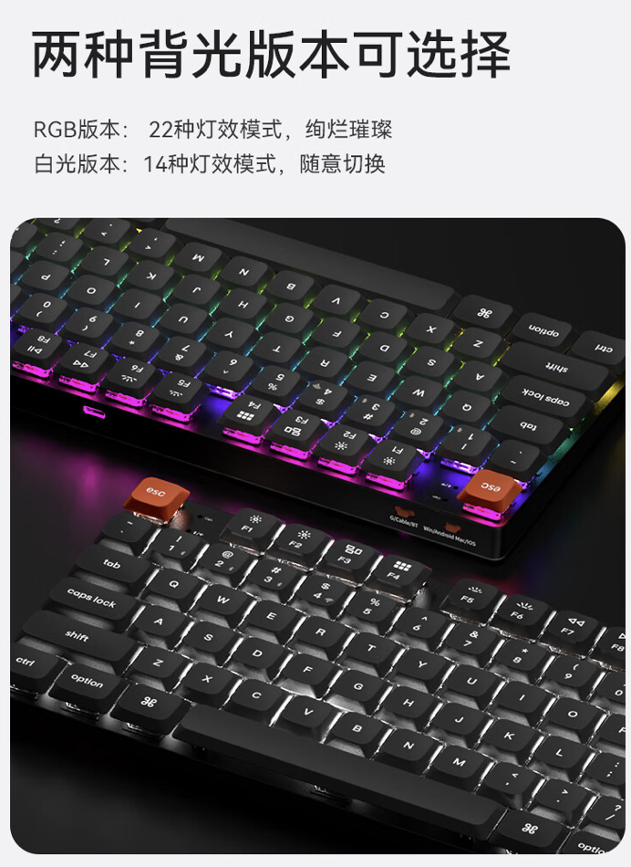 此外,这款键盘支持?QMK / VIA?改键,拥有?RGB?及白光版本,脚架支持调节?2.4 度 / 4.2 度 / 6.5 度三种角度。