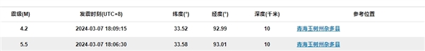 核心提示:快科技3月7日消息,据中国地震台网正式测定,今日18时6分在青海玉树州杂多县发生5.5级地震,震源深度10公里,震中位于北纬33.58度,东经93.01度。随后18时09分在青海玉树州杂多县(北...