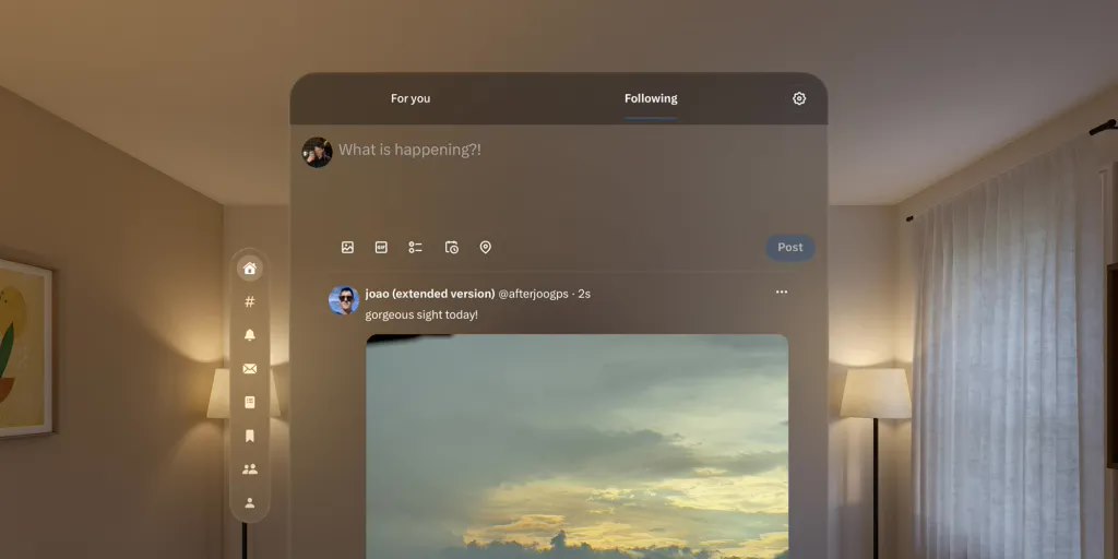但 X(推特)的旧版 API 已经停用,为此,这名开发者选择基于网页版推特开发这款应用,所以该应用据称“不依赖于”X 的 API。当然,作为 visionOS 原生应用,“Dusk”自然也提供了符合 Vision Pro 的交互逻辑和 UI 风格:半透明背景,侧边菜单,支持基于 Apple Vision Pro 的全面交互手势。